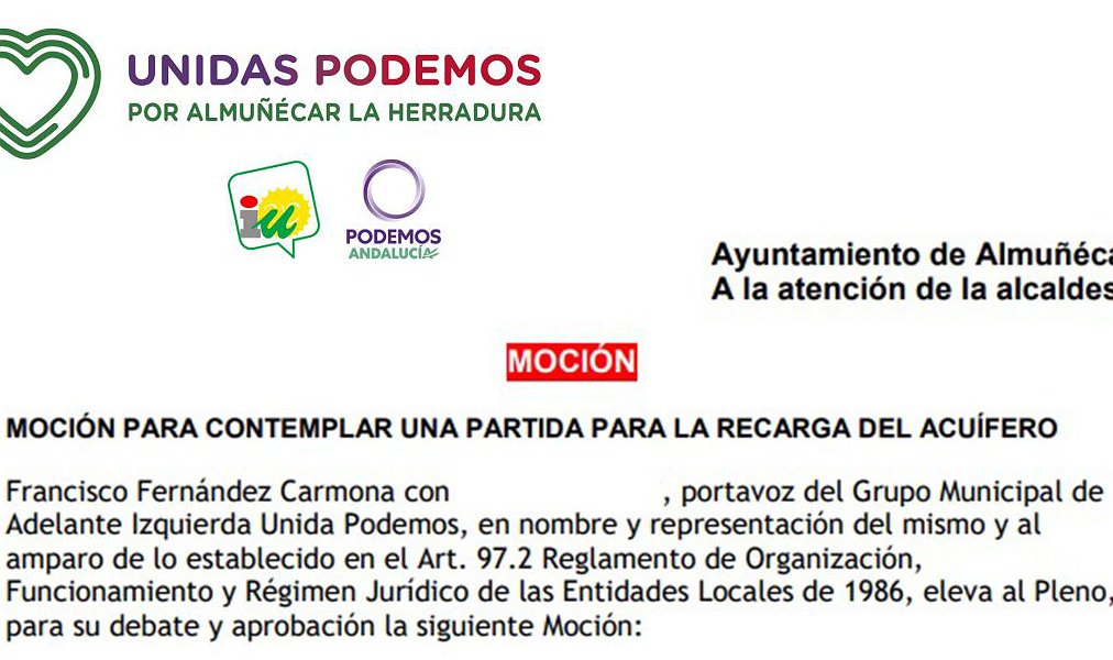 Ante los llamamientos “para contaminar nuestro acuífero” de quien quiere destruir nuestras vegas para construir campos de golf, la inoperancia e incapacidad de Mancomunidad y la Junta de Andalucía, en IU Podemos “volvemos a solicitar que el Ayuntamiento de Almuñécar dé un paso al frente y asuma el coste de la recarga”.
